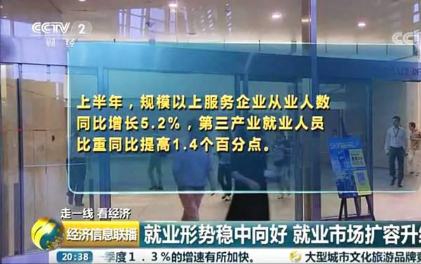 日前,CCTV2央視財(cái)經(jīng)頻道《經(jīng)濟(jì)信息聯(lián)播》報(bào)道:2018年上半年,全國(guó)規(guī)模以上服務(wù)企業(yè)從業(yè)人數(shù)同比增長(zhǎng)5.2%,第三產(chǎn)業(yè)就業(yè)人員比重同比提高1.4個(gè)百分點(diǎn),就業(yè)形勢(shì)穩(wěn)中向好,就業(yè)市場(chǎng)擴(kuò)容升級(jí)。